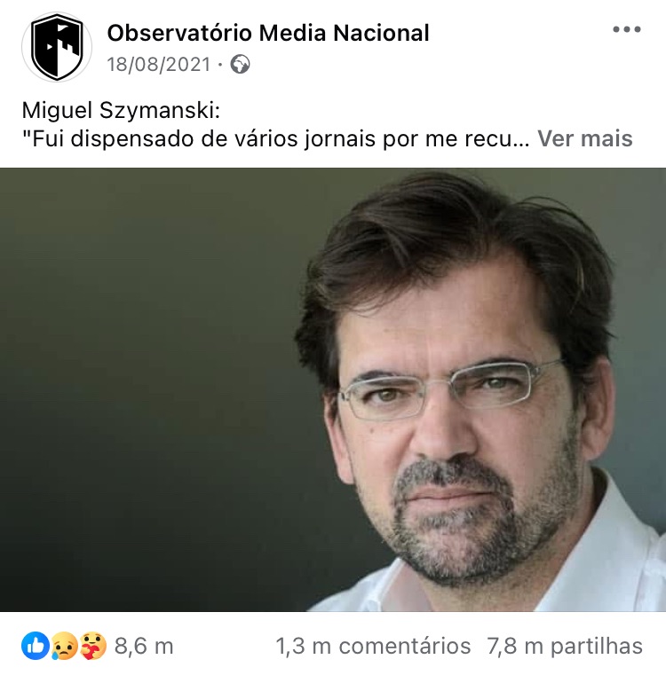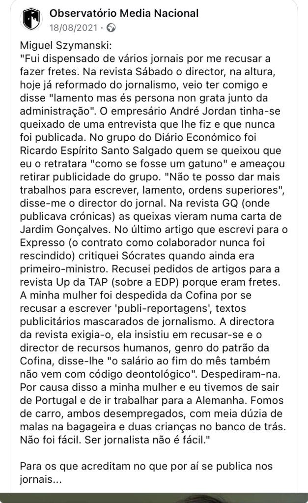 Pegaram então neste pequeno texto, um relato factual, com o testemunho de várias más experiências que a minha mulher e eu tivemos em grupos editoriais portugueses, e, no final, escreveram a sua, não minha, conclusão ou moral da história: “Para os que acreditam no que por aí se publica nos jornais…” O testemunho pessoal, partilhado milhares de vezes, é usado para dar boleia e a aparência de credibilidade (tal como a escolha do nome “Observatório” a prometer seriedade e isenção) a uma página cheia de meias verdades e mentiras.